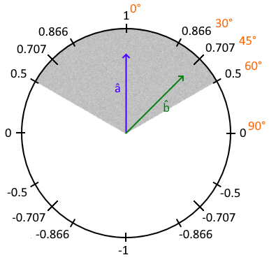 One important thing to note is that last way to calculate . If both and are normalized (unit vectors with a magnitude/length of 1), then just equals . is a number that ranges from -1 to +1. Given two unit-vectors, one pointing in the direction an object is facing, the other pointing in the direction of a 2nd object, ( means it’s a unit-vector) will tell you how much is “looking” at . If is 1, is looking directly at . If it’s we know that is looking about 45Β° off from . If it’s we know that is looking about 90Β° off from . If it’s (it’s negative), is somewhere behind where is looking.